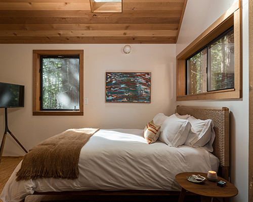 Newly renovated and stylishly curated in mid-century modern decor, the open concept loft welcomes you into a spacious sleeping area with a skylight overhead for tree or stargazing, and an alluring black and white tiled en-suite bathroom with large walk-in shower. Tucked into a corner nook is a window-encased desk, perfect for those who need to do a little work during their stay, or a reflective space for those who find their creative drives inspired anew.